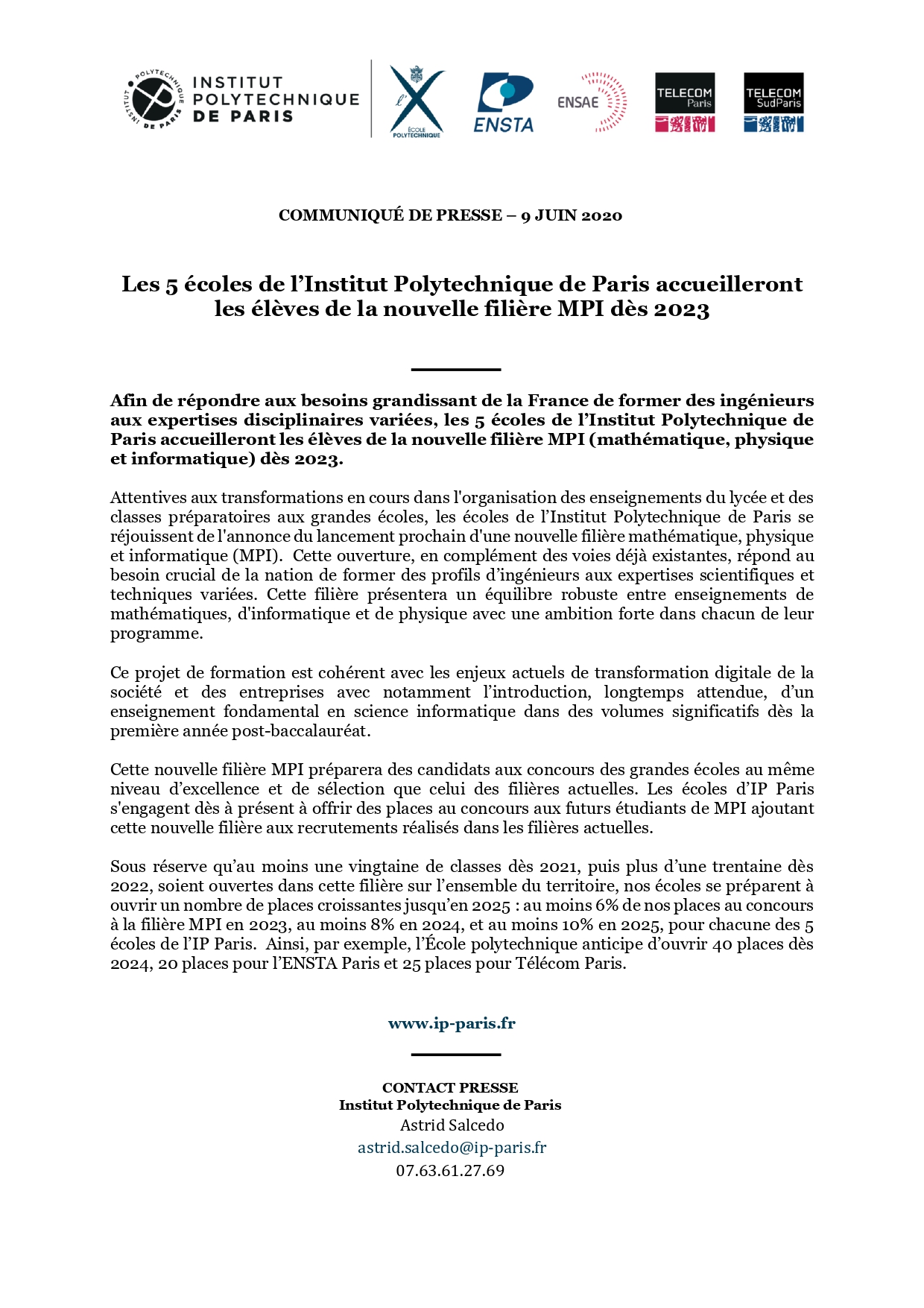 Les 5 écoles de l’Institut Polytechnique de Paris accueilleront les élèves de la nouvelle filière MPI dès 2023