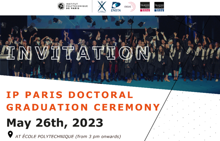 La cérémonie de remise des diplômes de doctorat de l'institut polytechnique de Paris se tiendra le 26 mai 2023, dans l'amphithéâtre Poincaré de l'Ecole Polytechnique. Les Docteurs 2022 peuvent s'inscrire directement sur leur espace personnel ADUM. Date limite le 8 mai 2023