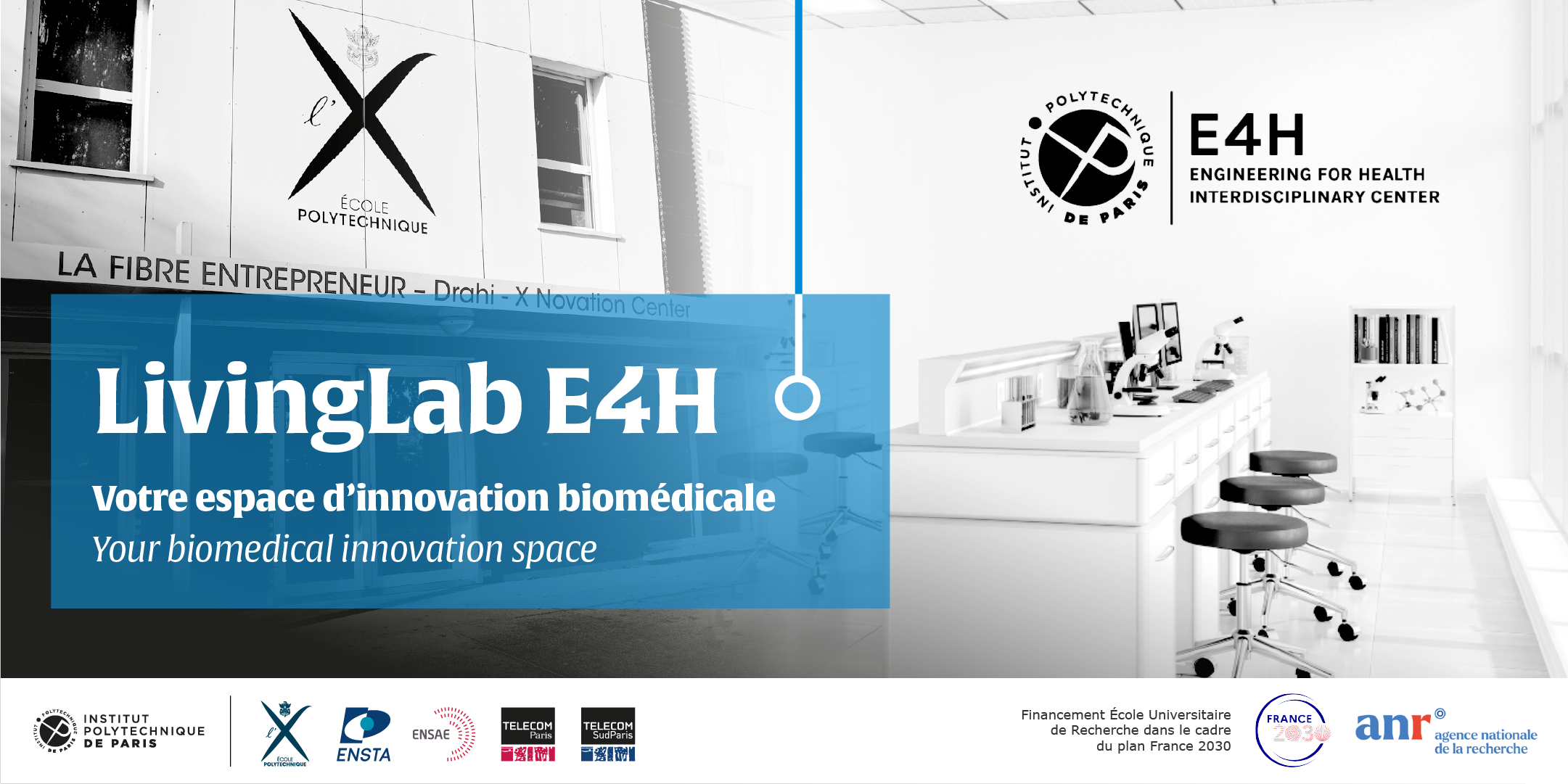 Le LivingLab E4H s’inscrit dans le cadre du Programme de formation en ingénierie biomédicale BERTIP - dont les partenaires sont l'Institut Polytechnique de Paris, l’École polytechnique, Telecom Paris, Telecom SudParis, l’ENSTA Paris, le CNRS, Inria, l’Inserm et le Groupe hospitalier Paris Saint-Joseph. Il bénéficie d’un financement ANR École universitaire de recherche (EUR) dans le cadre du plan France 2030.